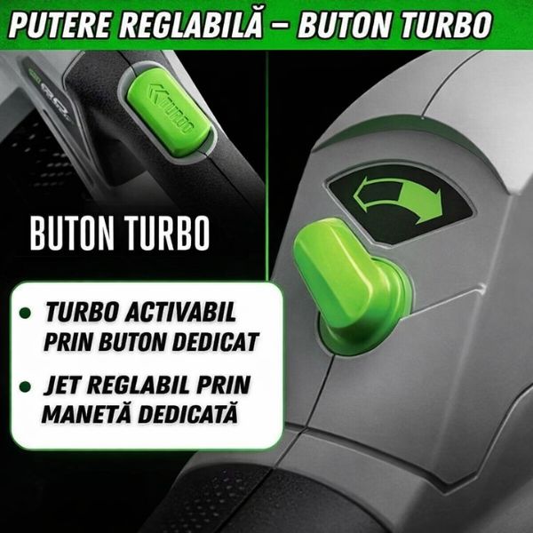 Cu BlowerXPro™ tu decizi puterea. Viteza reglabilă îți permite să dozezi forța la milimetru, adaptând jetul fiecărei situații: delicat atunci când este nevoie de precizie, brutal atunci când este nevoie de putere pură.