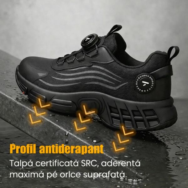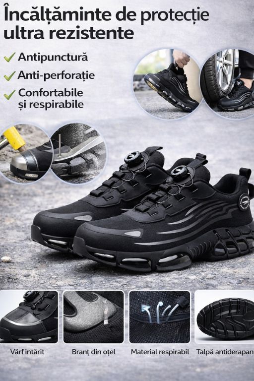 Te deplasezi în siguranță pe șantiere, în ateliere sau pe terenuri dificile, fără riscul de perforații sau lovituri. Acești pantofi îmbină tehnologie avansată și siguranță reală, fiind creați pentru cei care lucrează zilnic în medii solicitante.