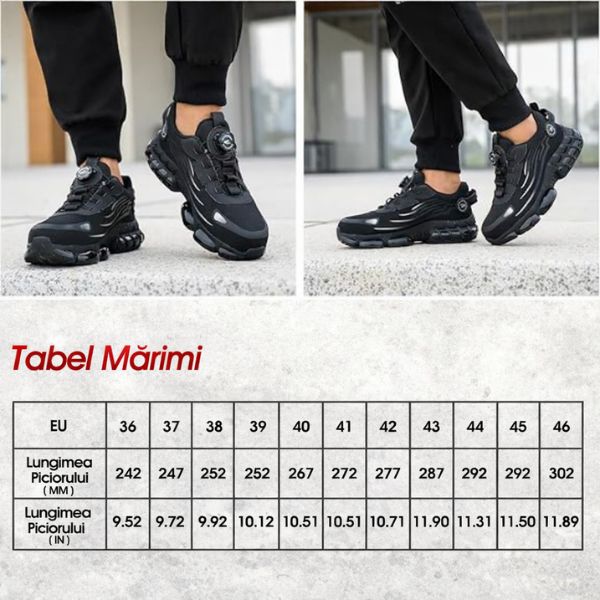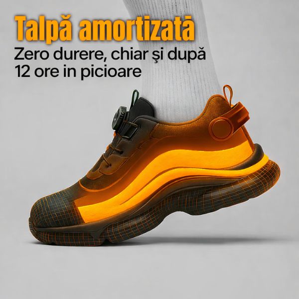 Fiecare pantof este echipat cu bombeu din oțel ranforsat, rezistent la impact și certificat conform standardelor europene de siguranță.